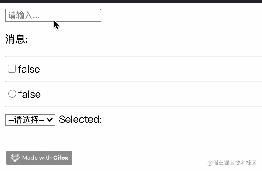 text和textarea元素使用valueproperty 和input事件;checkbox和radio使用checkedproperty 和change事件;select字段将value作为 prop 并将change作为事件。