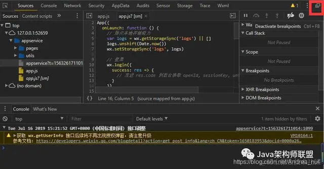 调试区用来打断点调试代码。点击上方菜单栏的调试工具按钮打开调试区。 在调试区的js文件: 带sm后缀的是用来打断点调试的文件,和写的代码是一样的。 不带sm后缀的是编译过后的文件,和写的代码也是一样的。只不过第一行出现了一个编译的信息。