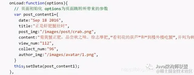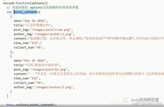 显示从服务器动态获取的数据 假设数据是从脚本文件向服务器动态获取的,那么应该在页面初始化之后显示数据。也就是说数据绑定的操作应该写在onLoad函数里面来,之后再使用setData()函数平铺入data数组之中。