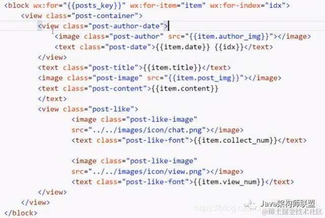 wx:for后面引入数组数据 wx:for-item后面引入元素指代(默认命名:item) wx:for-index后面指代的子元素的序号(默认命名:index) 注:如果指代为item,则可省略。因为微信小程序默认的元素指代就是以item命名的。