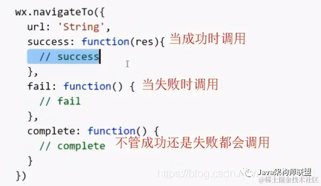 wx.navigateTo函数负责页面跳转 注:填入的url可以是相对路径也可以是绝对路径,但是需要和app.json中配置的形式一致(不要加.wxml)