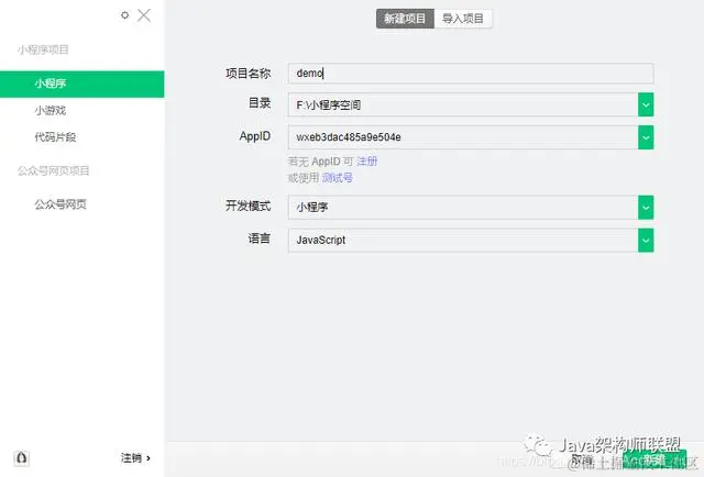 AppID选择使用测试号(因为注册小程序号比较麻烦) 其他选项设置好之后选择创建,进行创建新的小程序项目 平台会自动生成一个小程序HelloWorld的demo