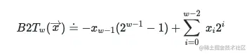 我们用 B2Tw 来表示一个补码。其中 w 代表二进制数的位长,B2T 的含义其实是 “二进制转补码”。计算补码实际表示的数,我们需要将每一位上的值和对应权重相乘然后进行相加。每一位(索引记为 i,从 0 开始,从右往左递增)的权重为 2i,但最高位的权重比较特殊,需要取负数,为 -2w-1。