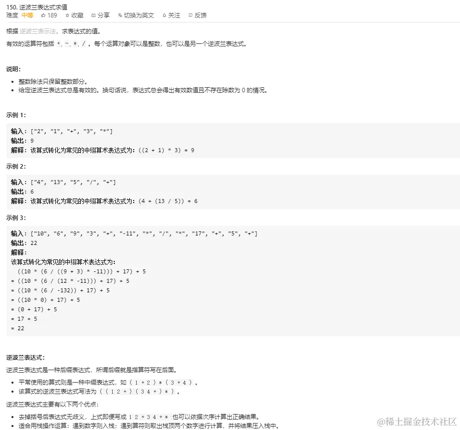 本题其实已经把解题思路说明白了,值得注意的是减法和除法中运算的两个数的前后位置。对于给定的逆波兰表达式,例如:["4", "13", "5", "/", "+"]。遍历该逆波兰表达式,遇到数字,直接入栈,栈内现在元素为[4, 13, 5]。当遇到运算符"/"时,取出栈顶的两个元素,分别是 5 和 13,**将 13 / 5 ** 即 2 结果放回栈内。遇到运算符"+",取出栈顶的两个元素,分别是 2 和 4,将 2 + 4 即 6 结果放回栈。此时表达式遍历完毕,返回栈内元素,即结果。