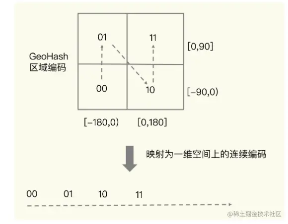 假设现在A店铺的地址为(116.37,39.86) ,每一组的地址都由2个值组成,这样进行比较是非常不方便的,因此需要通过一种编码的格式,来转化为一个值,这样比较起来就很方便