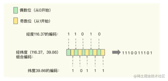 用了 GeoHash 编码后,原来无法用一个权重分数表示的一组经纬度(116.37,39.86)就可以用 1110011101 这一个值来表示,就可以保存为 Sorted Set 的权重分数了