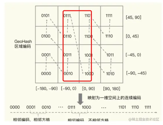 在这个图里面,0111 和 1000 是相邻的2个格子,但是从图中可以看出来,其实2者的位置相差甚远,所以,为了避免查询不准确问题,我们可以同时查询给定经纬度所在的方格周围的 4 个或 8 个方格