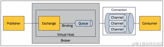 信道是建立在真实的TCP连接内的虚拟连接, AMQP 命令都是通过信道发出去的,不管是发布消息、订阅队列还是接收消息,这些动作都是通过信道完成。