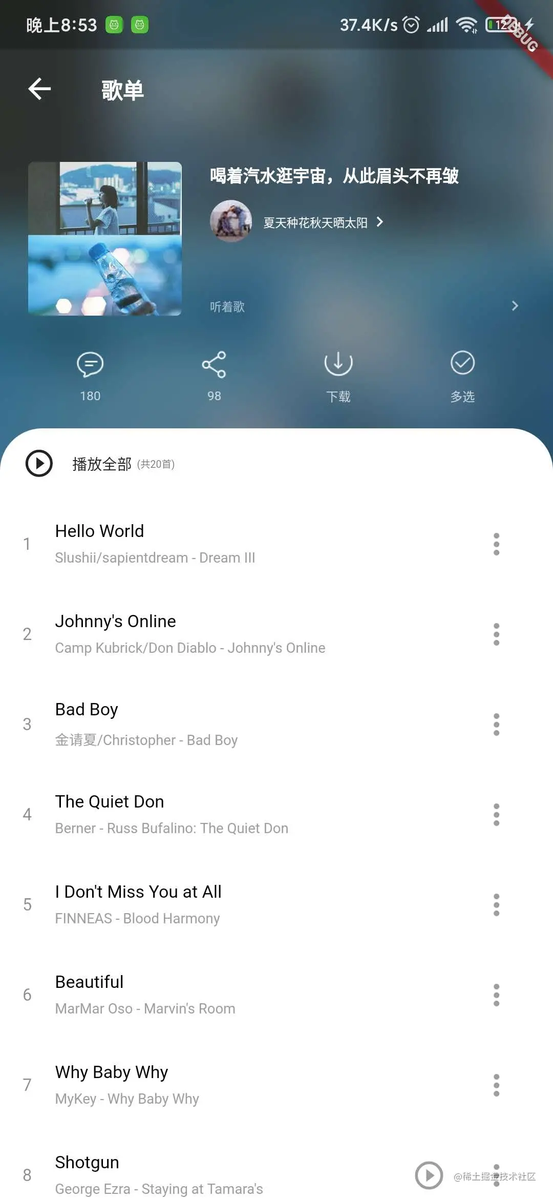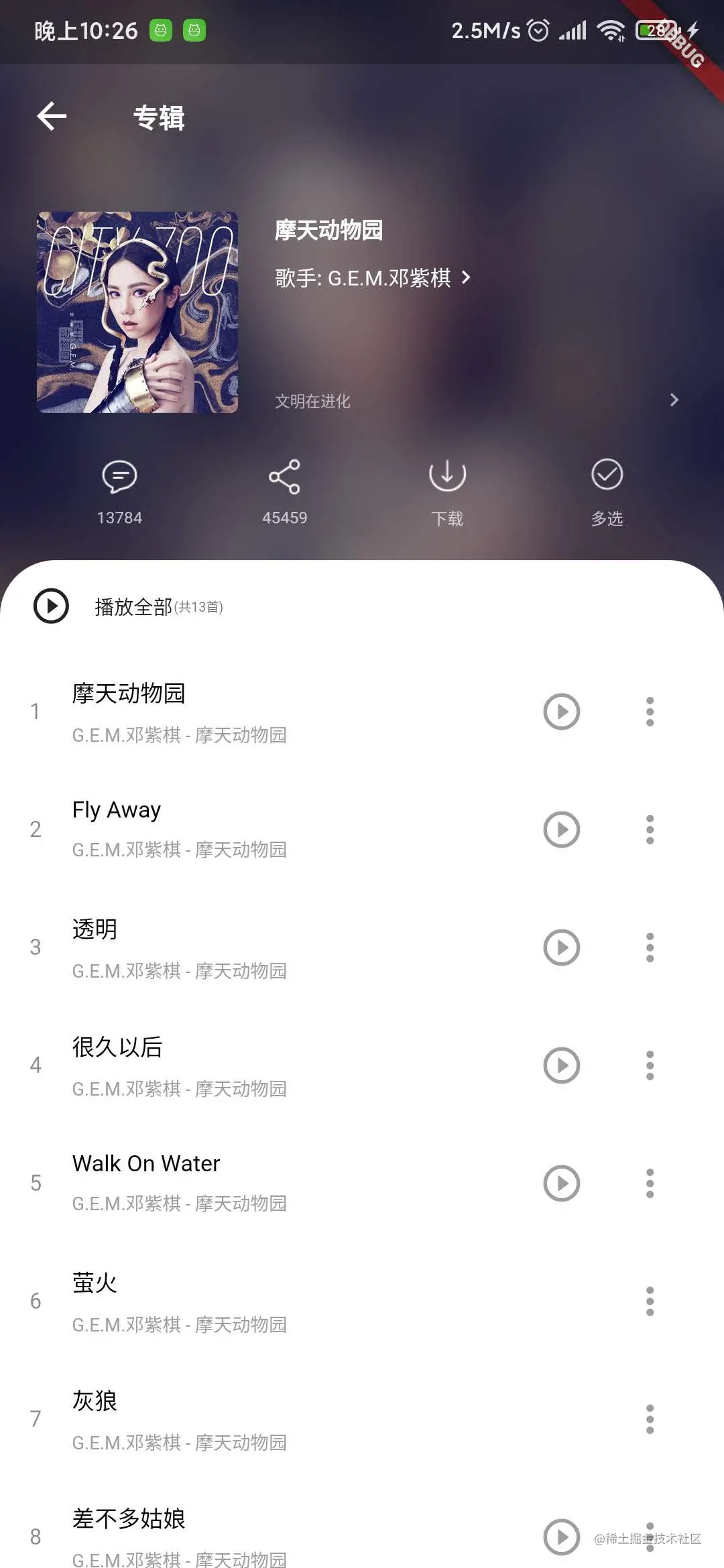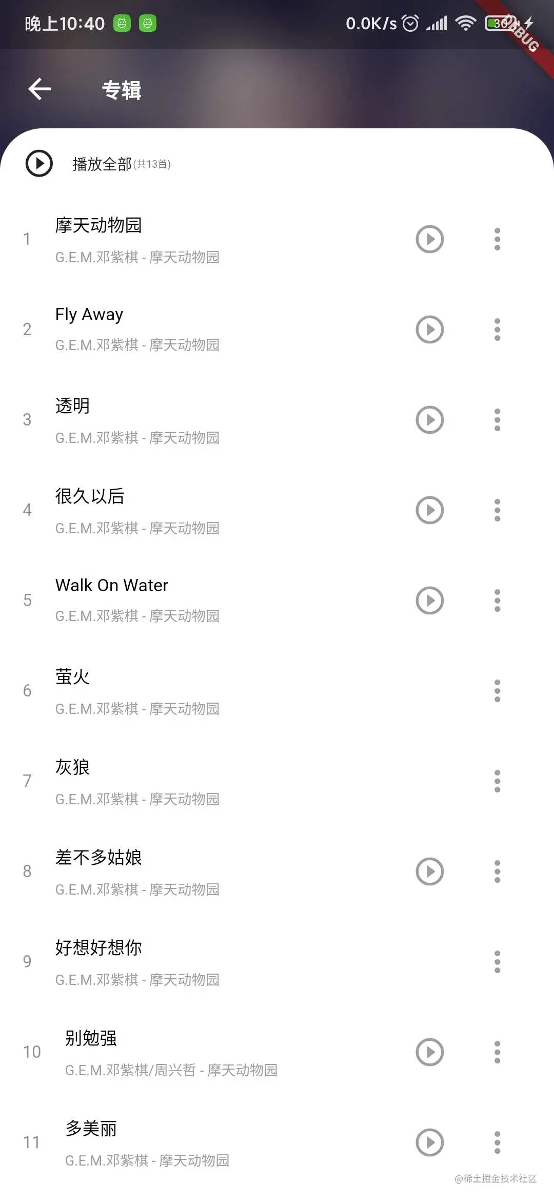 另一块是SliverSongList,需要传入歌单或专辑中的关联歌曲列表,点击对应的歌曲item后可以跳转到播放页进行播放。