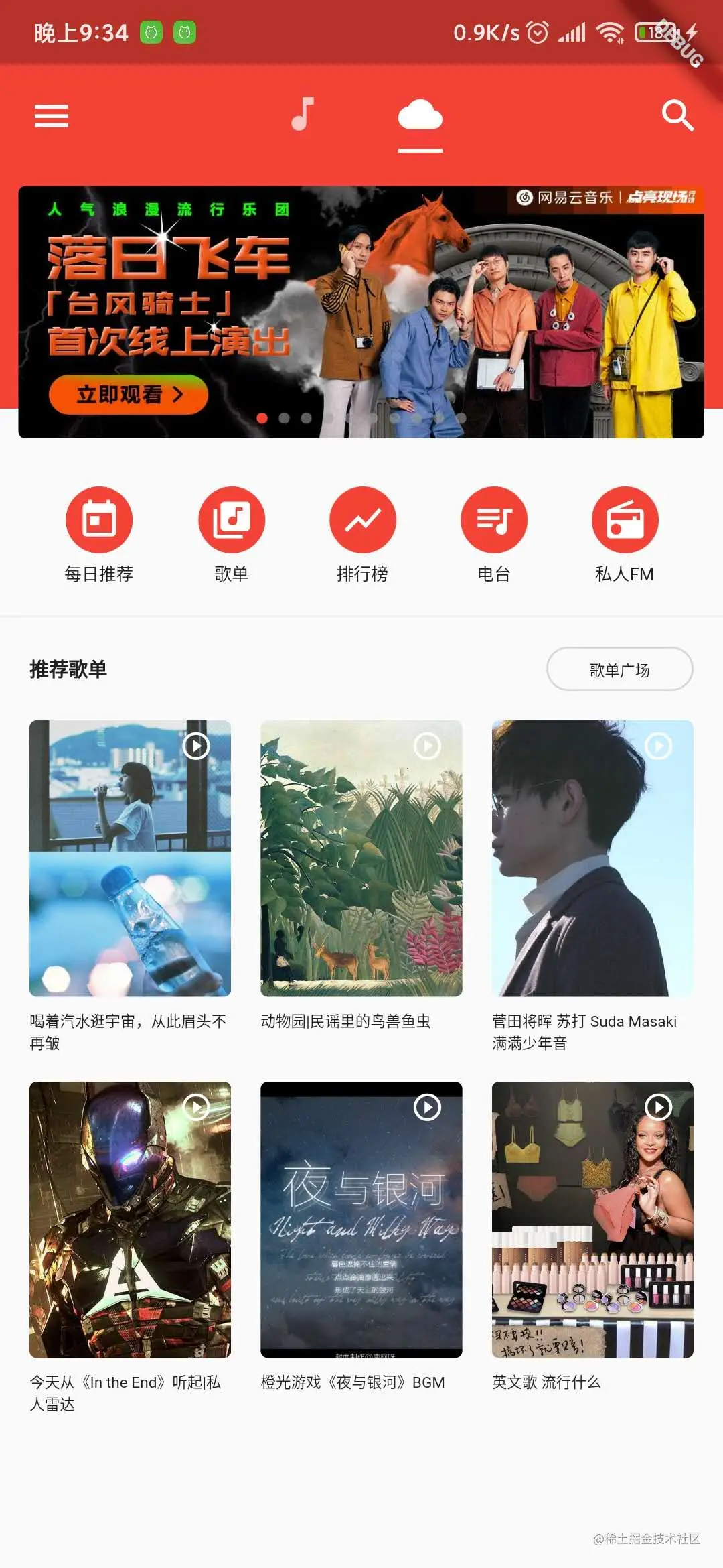 主页的话,仔细看可以分三个区块出来,分别是上部的轮播图,中部的跳转按钮列,底部的推荐歌单,可以单独实现这3个组件然后再放到主页面,方便维护。