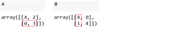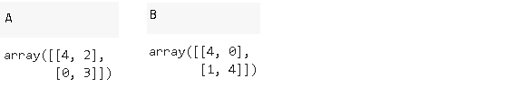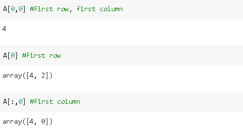 2x2矩阵有2行2列。行和列的索引以0开头。例如,A(索引为0的行)的第一行是[4,2]的数组。A的第一列是[4,0]的数组。第一行和第一列的元素是4。