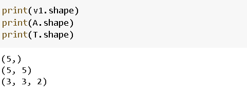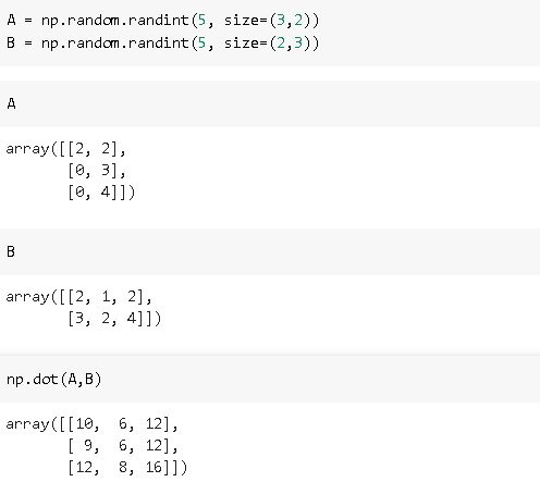结果矩阵的形状将是3x3,因为我们对A的每一行进行3点积运算,A有3行。确定结果矩阵形状的一种简单方法是从第一个矩阵中提取行数,从第二个矩阵中提取列数: