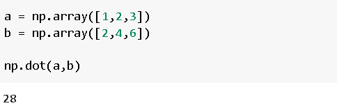 两个向量的点积是元素相对于其位置的乘积之和。第一个向量的第一个元素乘以第二个向量的第一个元素,依此类推。这些积的和就是点积。在NumPy中计算点积的函数是dot()。