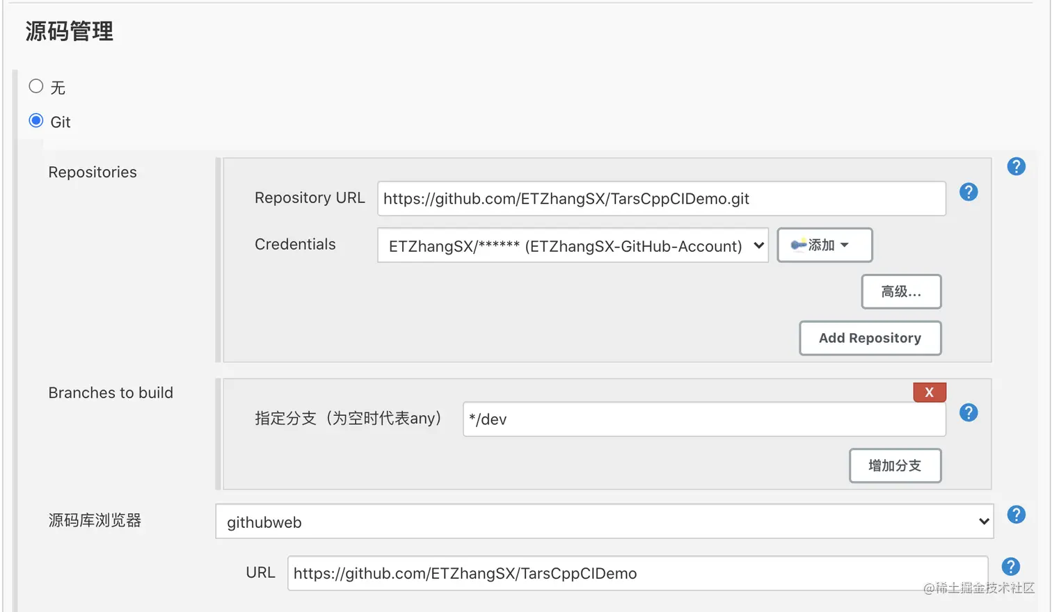 指定分支 中可以选择你需要操作的分支,比如只对 dev 分支执行构建操作。这里不推荐使用master 分支,可新建 dev 分支用于代码提交。