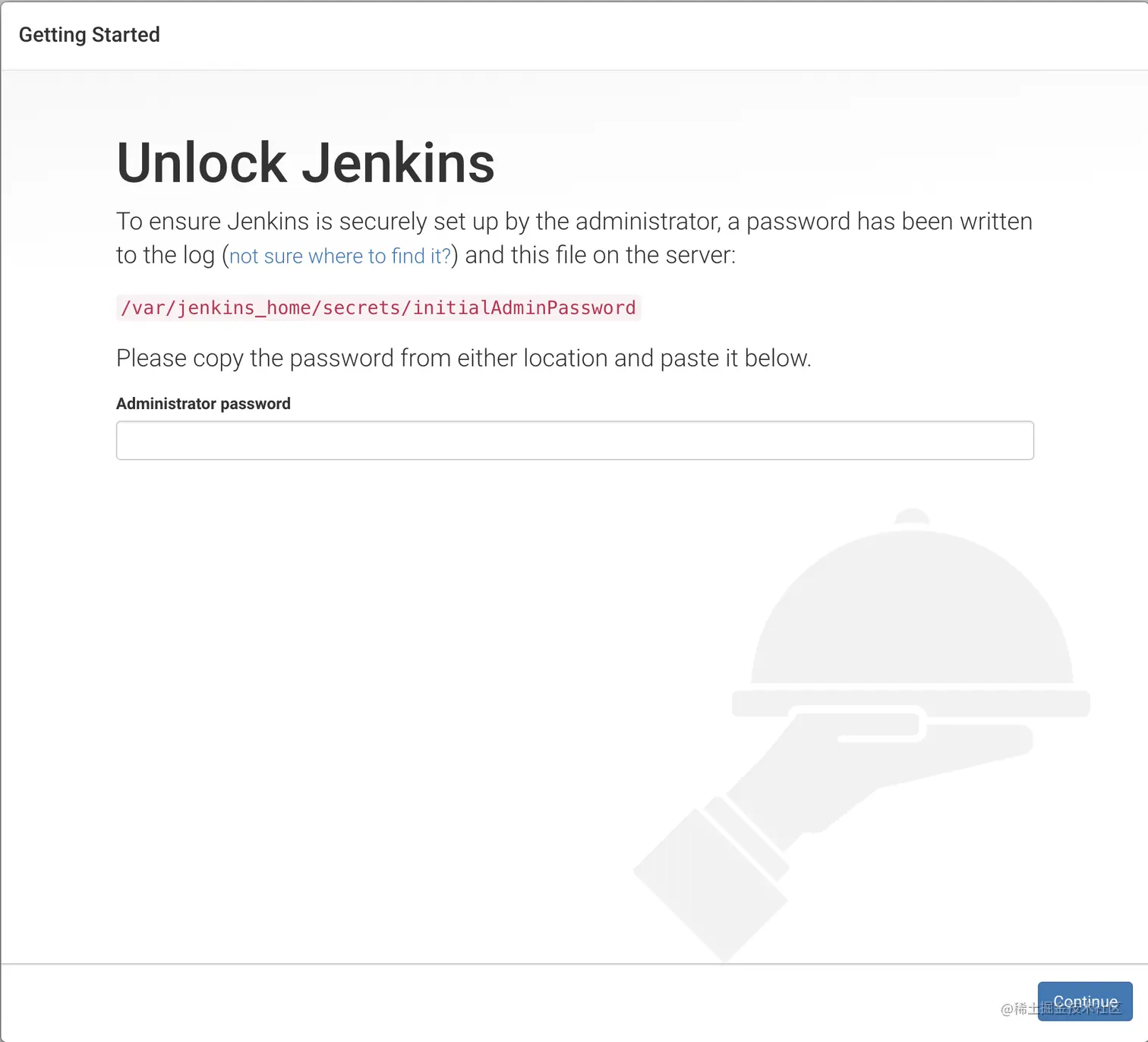 第一次访问需要使用 Administrator password 解锁,在日志和服务器文件 /var/lib/jenkins/secrets/initialAdminPassword 中可以找到,我们使用 cat 命令输出密码