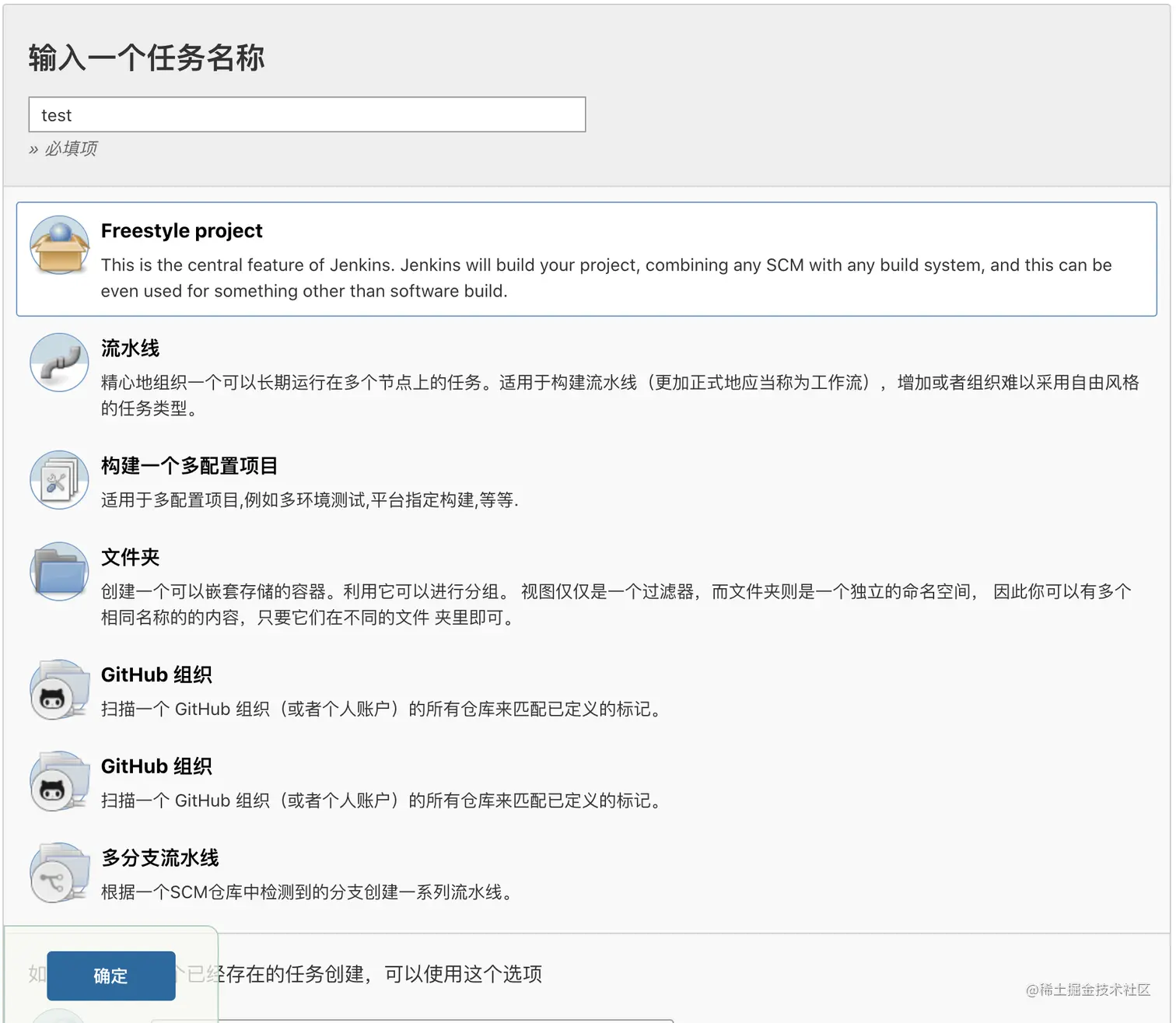 在Jenkins主页点击 新建任务,输入名字后,这里我们选择构建自由风格(free style)的项目,点击 确定