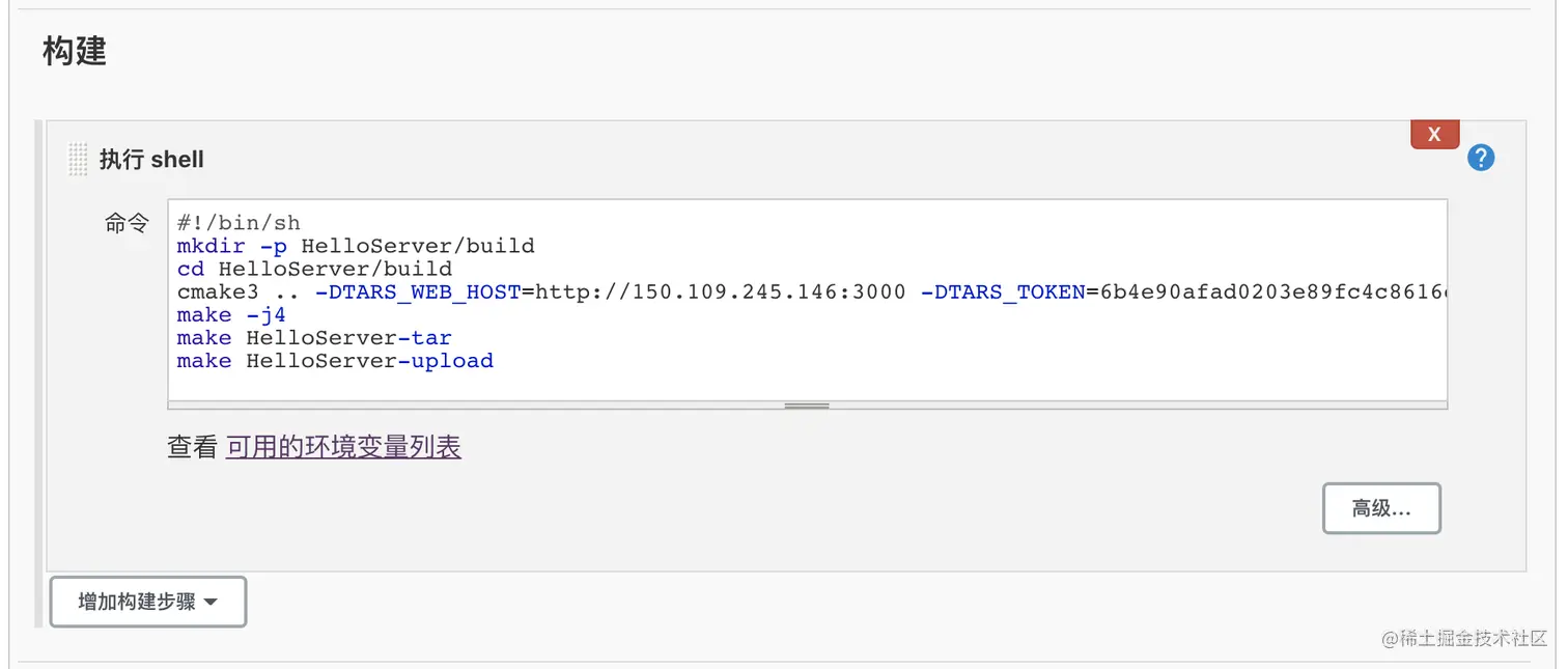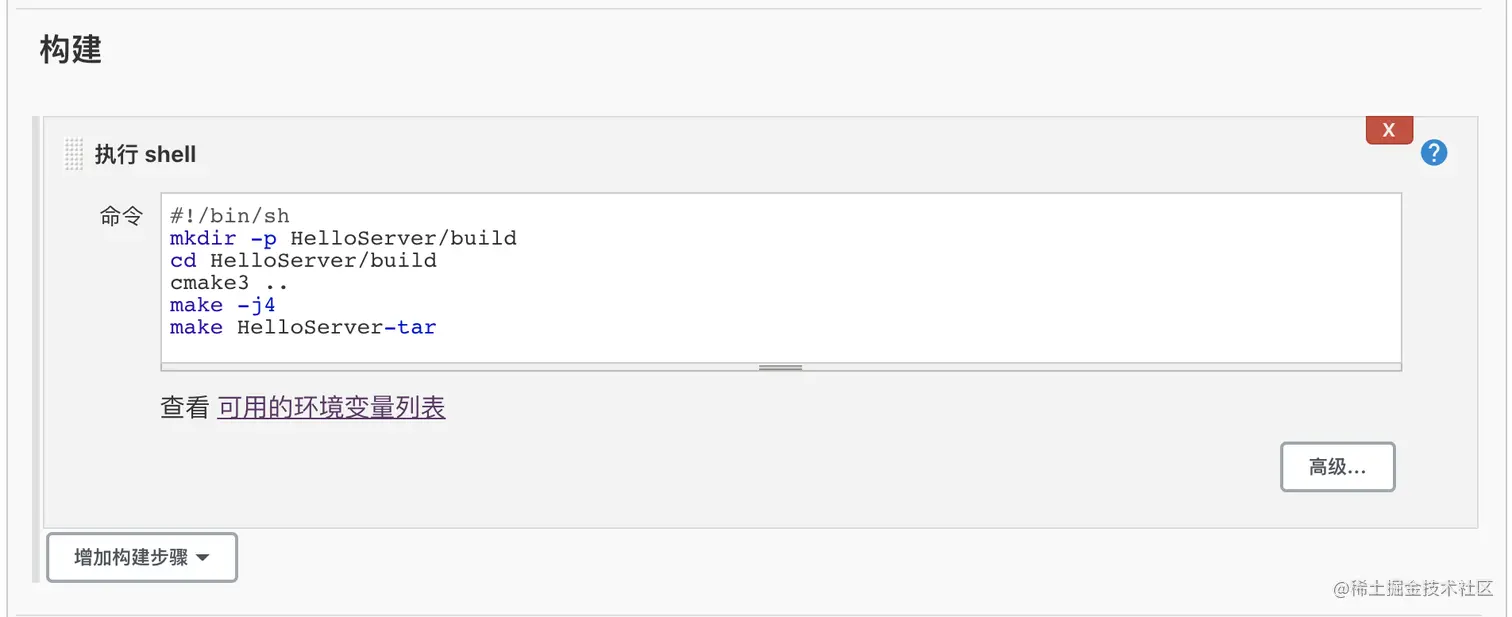 构建 中可根据自己的需求编写构建的脚本了,在本文生成的测试项目中使用了 TarsCpp,因此构建步骤选择了 执行 shell ,然后通过以下简单的 shell 脚本即可完成项目的构建。
