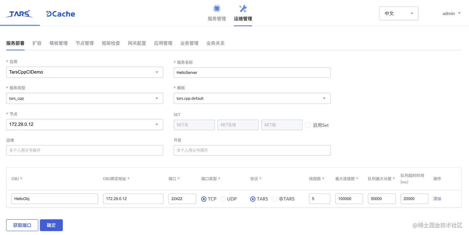 注意,在触发 Jenkins 进行自动部署之前,我们需要提前在 TarsWeb 上进行服务部署,相当于注册服务,后续才能正常发布服务,如下