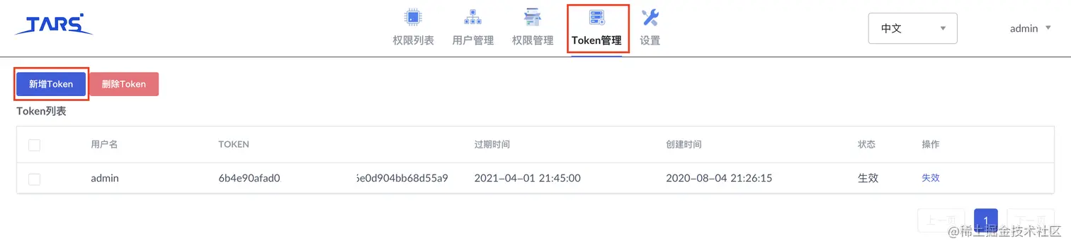 首先,登录 TarsWeb 管理页面,点击页面右上角用户名下拉栏中的 用户中心 ,然后点击 Token管理--新增Token,选择失效日期和时间后点击 确定 即可成功生成 Token,复制保存 Token 备后续步骤使用。