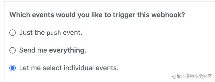 修改 webhook 的 trigger 方式为 Let me select individual events,即自定义事件,如下