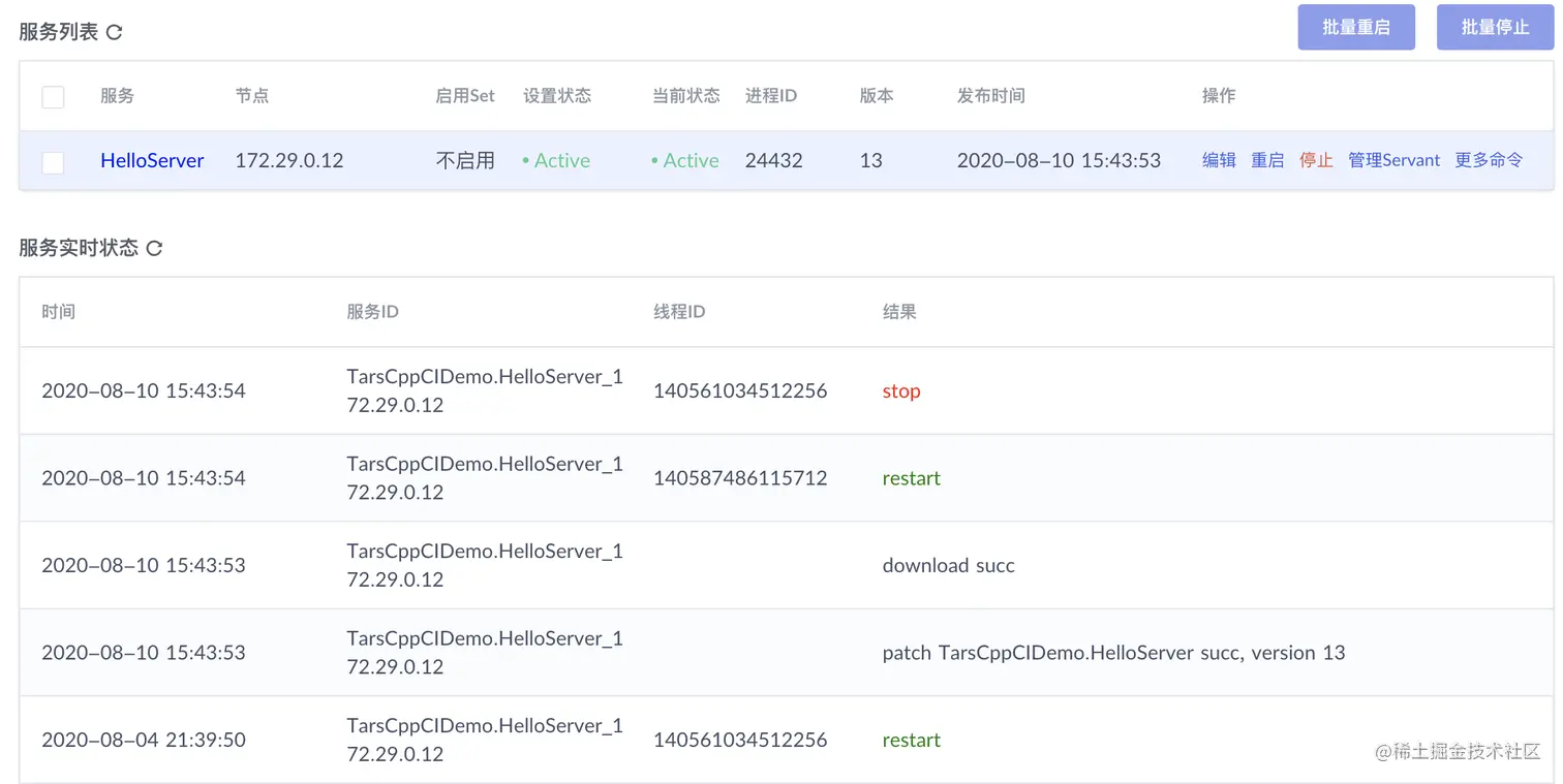 回到 Jenkins 页面,我们可以看到自动部署任务被触发,如果显示构建成功,我们打开 TarsWeb 管理页面,可以看到服务已经发布运行。