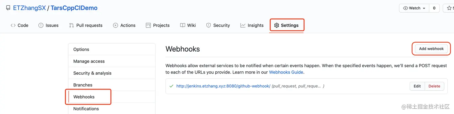 选择自己在 GitHub 上的 TARS 项目,点击 Settings->Webhooks->Add Webhook,
