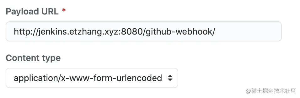 在 Payload URL 中输入 http://${IP}:8080/github-webhook/ ,其中 IP 为部署 Jenkins 的服务器 IP 或者域名。