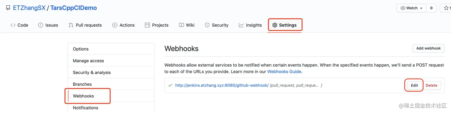 由于 master 分支用于 TARS 服务的自动化部署,一般不直接提交代码,而是通过其他分支合入,因此我们需要获取 master 分支的 Pull requests 事件。我们打开 GitHub 项目 TarsCppCIDemo 的 Webhooks 设置,点击对应 webhook 的 Edit