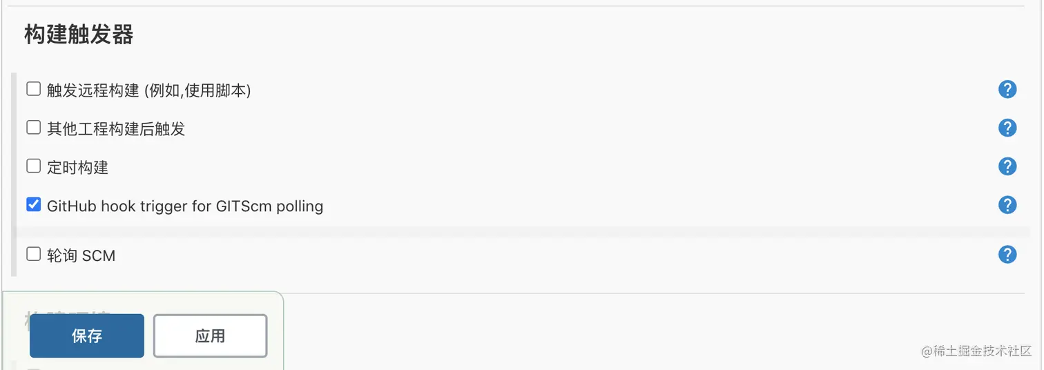 构建触发器 中我们勾选 GitHub hook trigger for GITScm polling,这样每次获取到 GitHub 的 webhook都会触发构建。