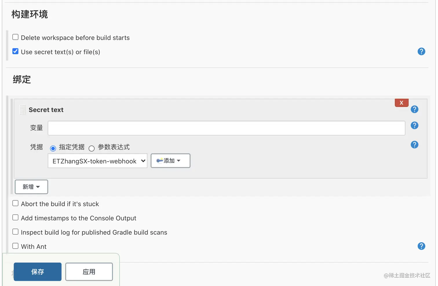 构建环境 中选择 Use secret text(s) or file(s),然后在 绑定 的 新增 中选中 Secret text,凭据 选择 指定凭据,下拉栏选中之前保存的 webhook token。