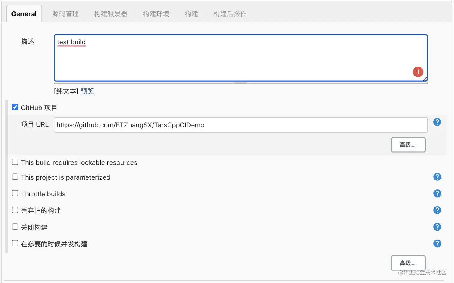 进入任务配置,在 General 中,填写任务的描述,勾选 GitHub项目,填写你的项目构建地址,这里我新建了一个测试仓库 TarsCppCIDemo.