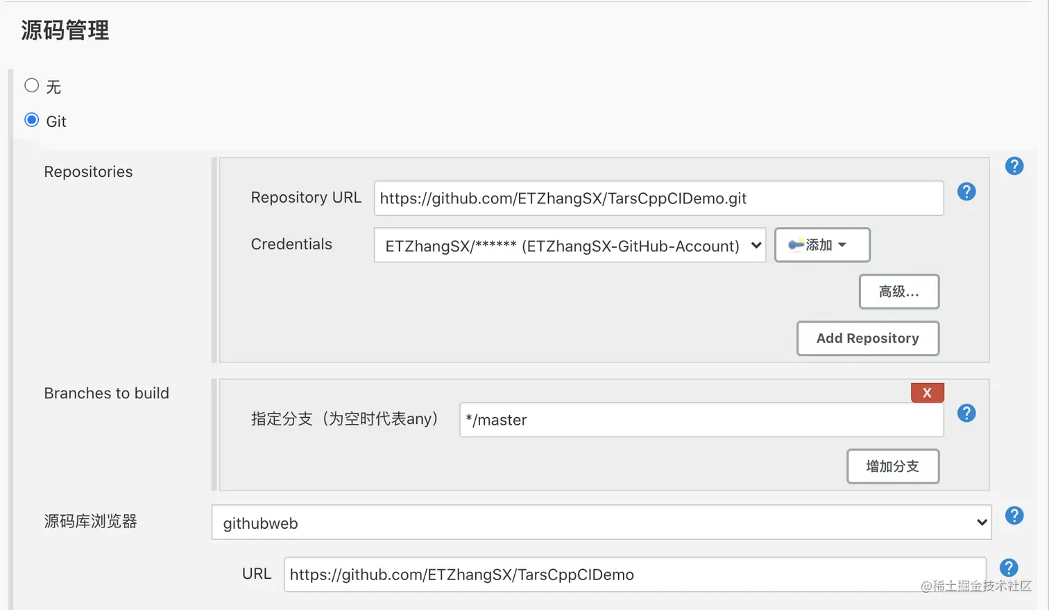 源码库浏览器 选择 githubweb,URL 填写项目地址,这样每次构建生成的 changes 可以链接到 GitHub,查看变更的详情。