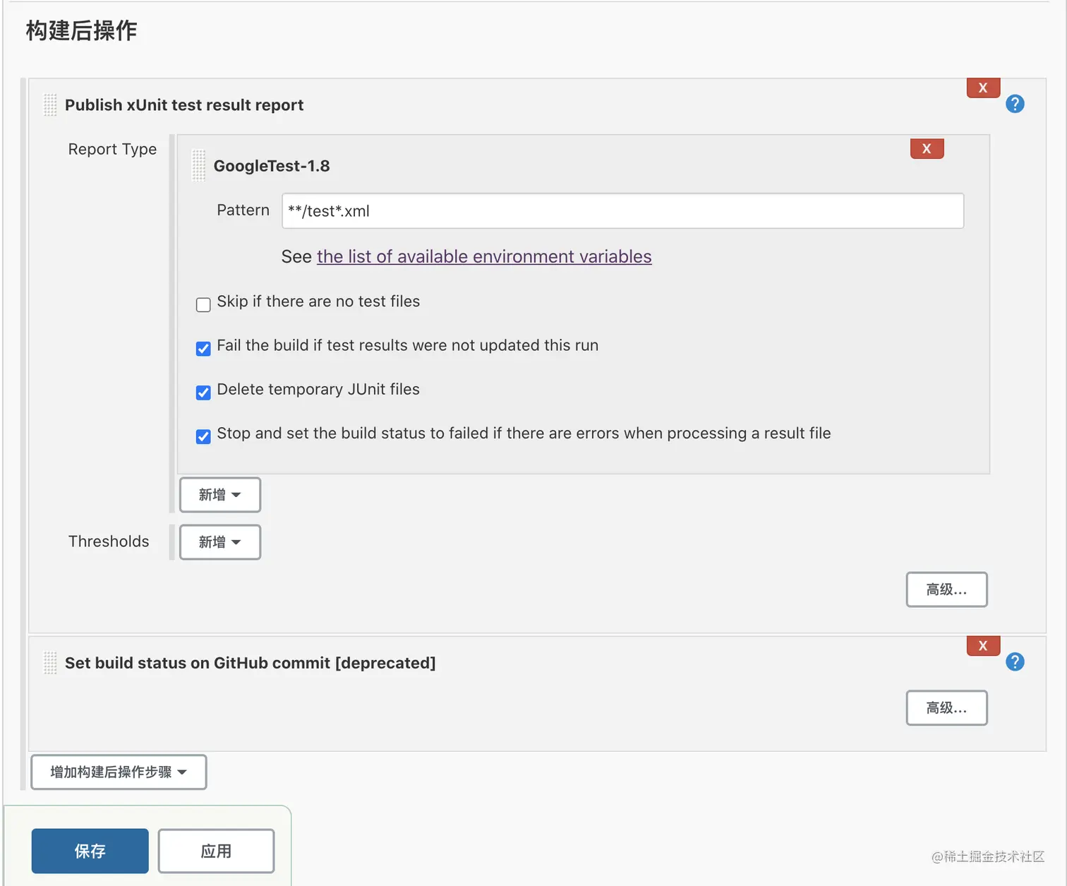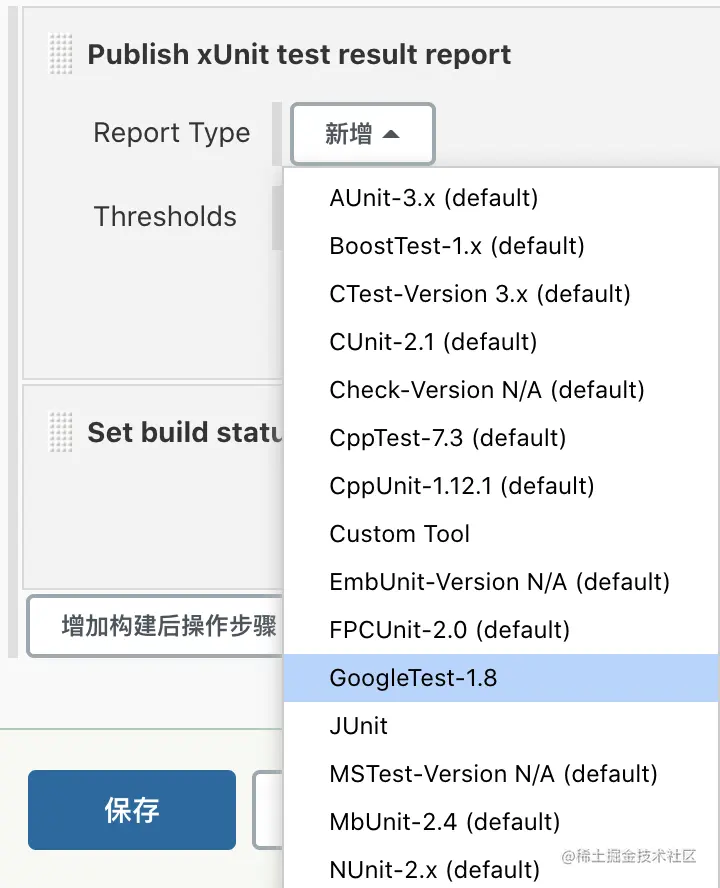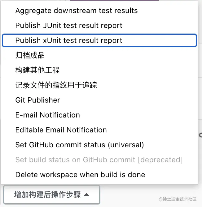 点击 增加构建后操作步骤 选择 Publish xUnit test result report,新增构建后步骤,如下