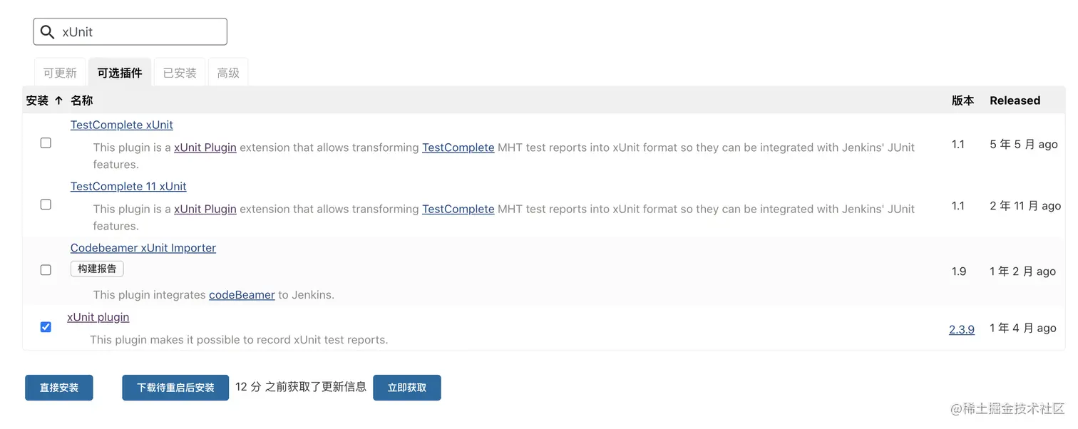 打开 Jenkins 的管理页面,进入 系统管理->插件管理->可选插件,在搜素框中搜索 xUnit,在出现的结果中选择 xUnit plugin,点击 直接安装 后,等待 Jenkins 安装重启即可。
