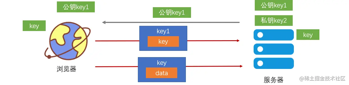 使用非对称加密应该就可能是这样的情况:服务器产生一对密钥(key1,key2),通过明文传输公钥 key1 给客户端,客户端生成一个对称加密的密钥key,然后通过key1加密传输给服务器,然后服务器使用私钥 key2解密得到key,然后服务器和客户端之间通过 key 来加密解密数据,就像这样: