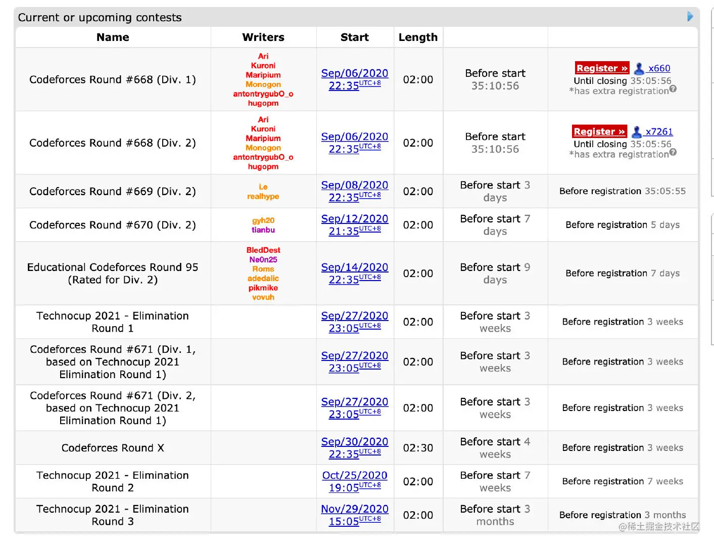 比如上图就是目前的一个比赛安排计划,即将开始的比赛会多出来一个register按钮,让大家注册参加。