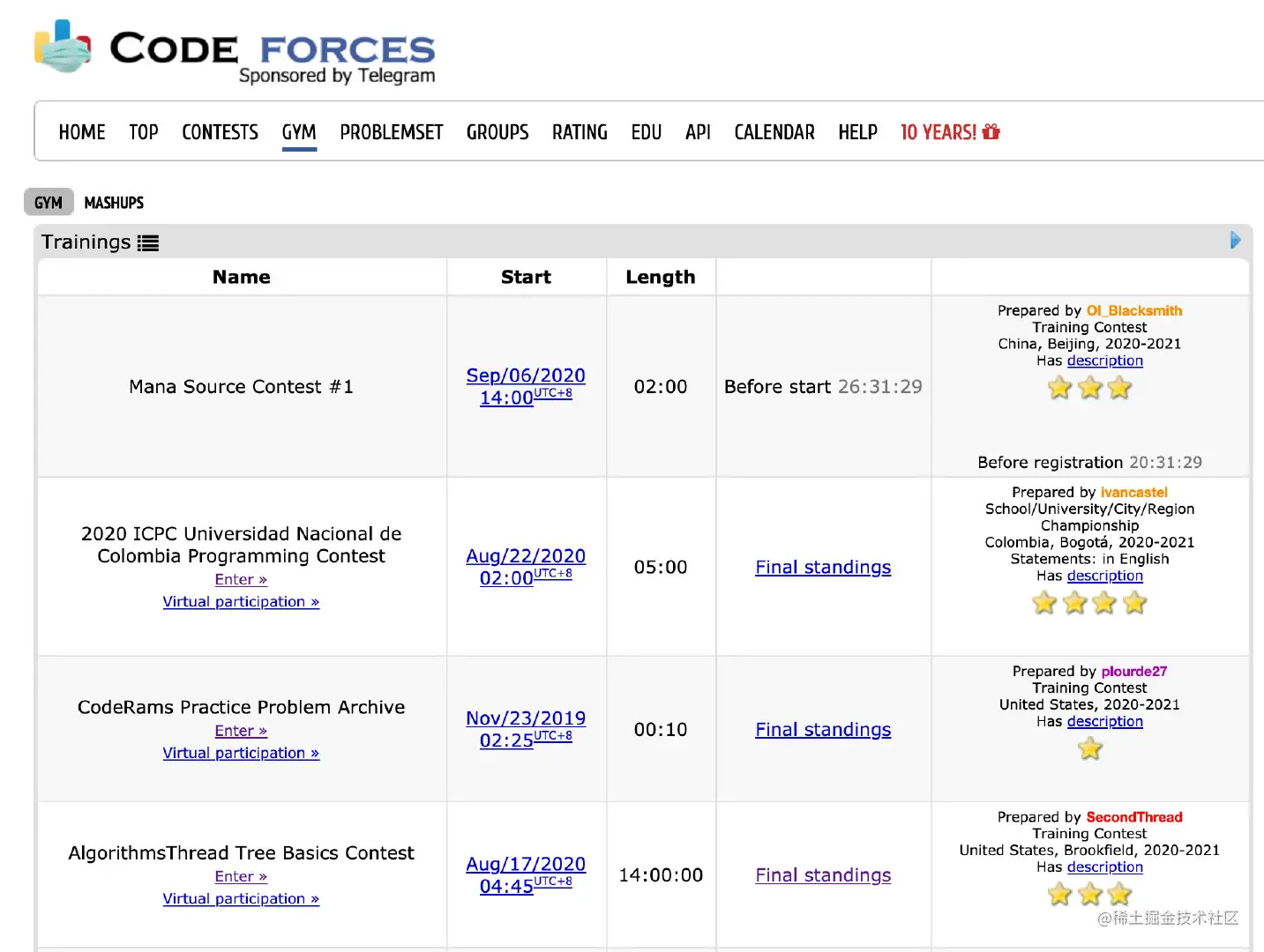 gym栏目下的一般是一些专业的比赛题以及acm的练习题,和contest里面的题比起来gym里面的题难度会更大一些。并且也会有各种算法和数据结构的专题。虽然看起来难度更大,但是里面的题目也是有区分度的,并不是每一题都很难,即使水平一般也是可以做一两道的。