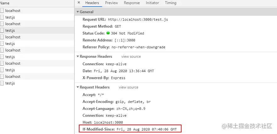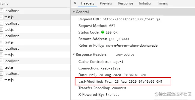 res.setHeader('Cache-Control', 'max-age=1') // 设置1秒后过期以方便我们马上能用Last-Modified判断