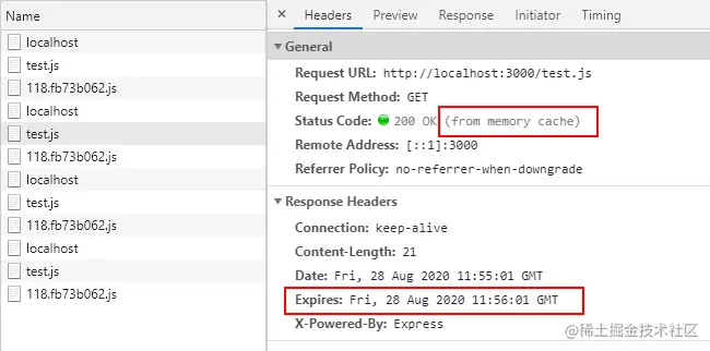 上面代码我们添加了 Expires 响应头,第一次向服务器发起请求后,同时返回过期时间和文件;当再次刷新时,就会看到文件是直接从缓存(memory cache)中读取的;当 1 分钟过后过期了,又会重新请求了。