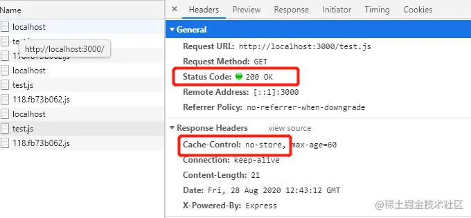 多次刷新网页,重新进入,可以看到每次都重新发了test.js的请求,这种方式下没有进行任何缓存。