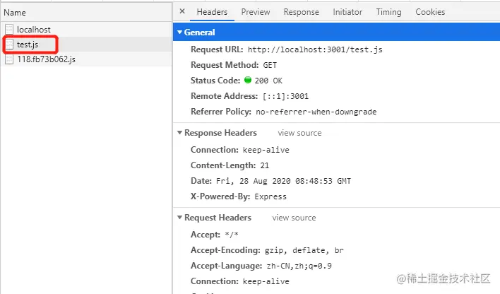 test.js,返回给浏览器 - 浏览器再次请求,服务器又重新读取磁盘文件