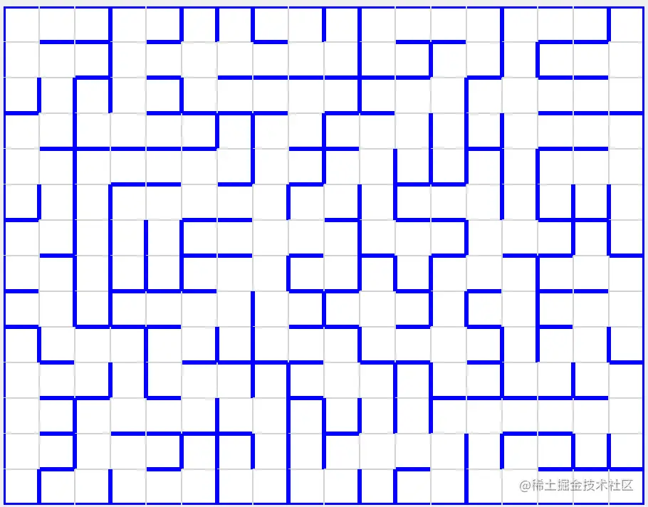 我们把这个算法稍微演变一下,就可以使用在迷宫生成上了,因为本质上迷宫每个点就是图上的点,然后每堵墙就是点和点的连线。设计迷宫,就是通过打通若干墙壁,使得每个点都可以走到迷宫上的另外任意一个点。