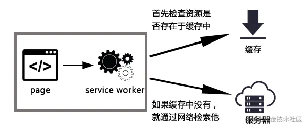 serviceworker拦截http请求,首先去检查请求的资源在缓存中是否存在,如果存在,则直接从缓存中调用,而且即便是无网络情况下,serviceworker也能调用缓存中的资源。如果缓存中没有请求的资源,则通过网络去服务器上检索,而且在找到并响应时,serviceworker会将其存入缓存中,以备下次再请求时直接从缓存中调用。