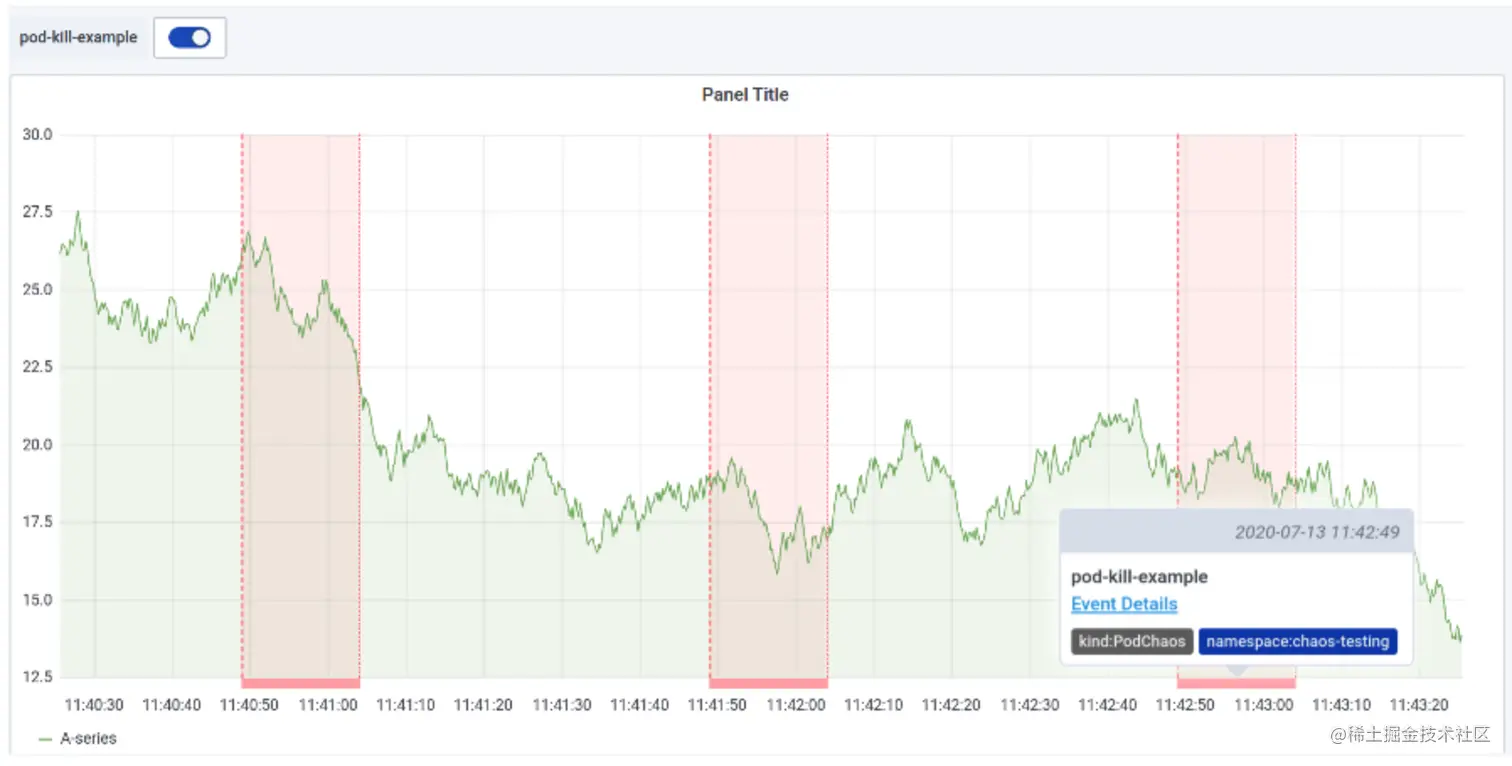 Chaos Mesh 为了进一步提高混沌实验的可观测性,单独开发了 Grafana 插件,方便用户直接将混沌实验的运行信息展示在自己的监控面板上。用户在 Grafana 上安装了此插件后,可以直接在应用的监控面板上开启混沌实验信息按钮,此时混沌实验的相关信息会以 Annotations 的方式在当前的面板上展示出来,这样用户就可以在一个界面上同时观察到应用的运行情况以及当前运行的混沌实验信息。