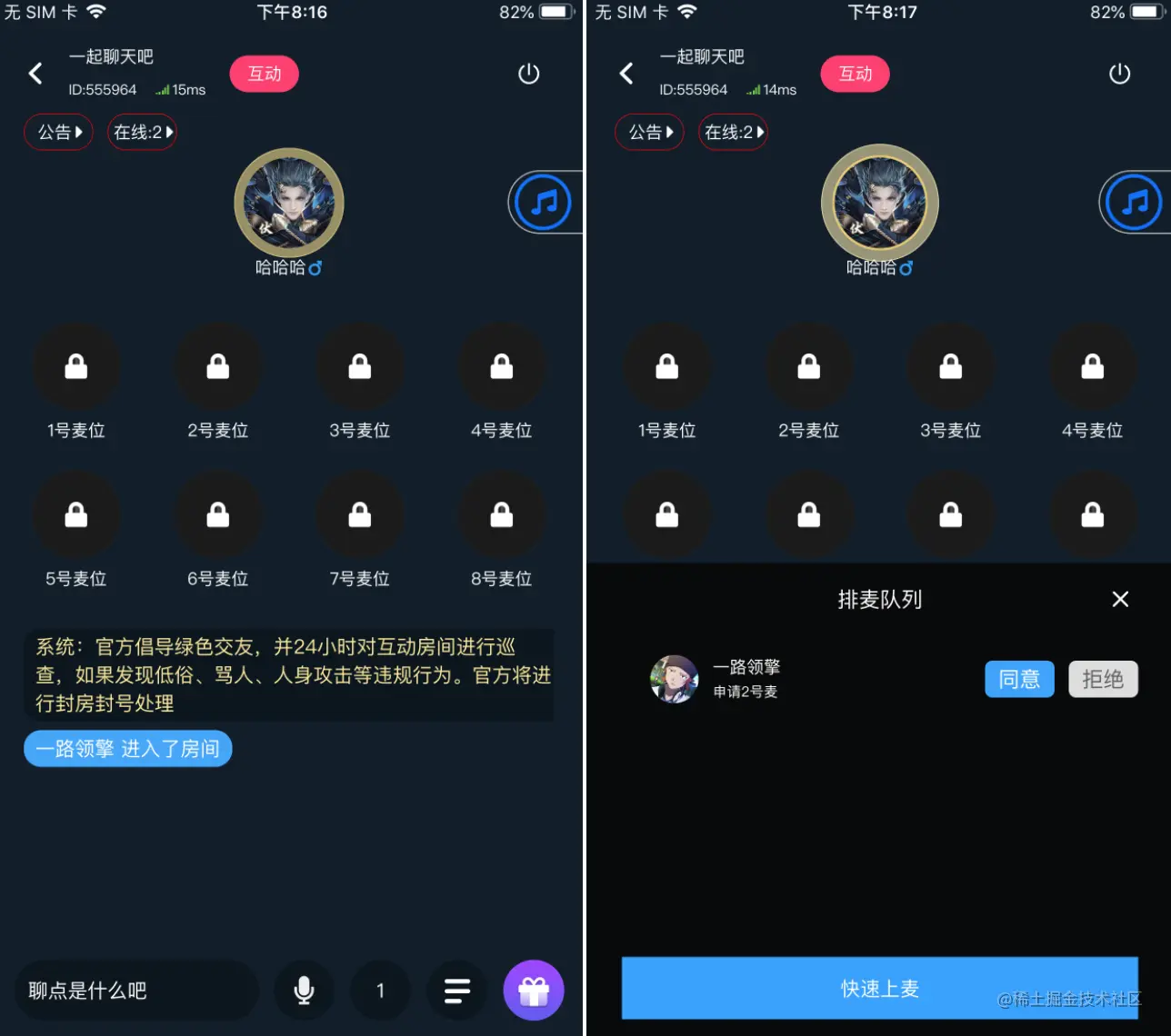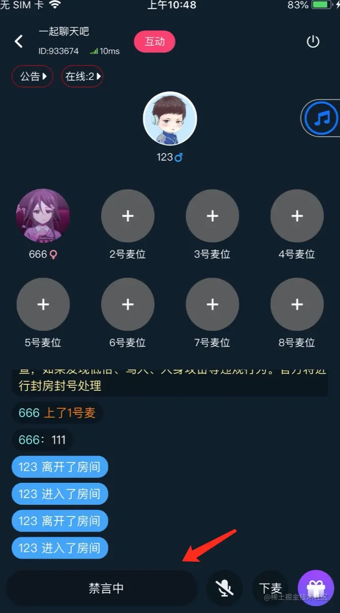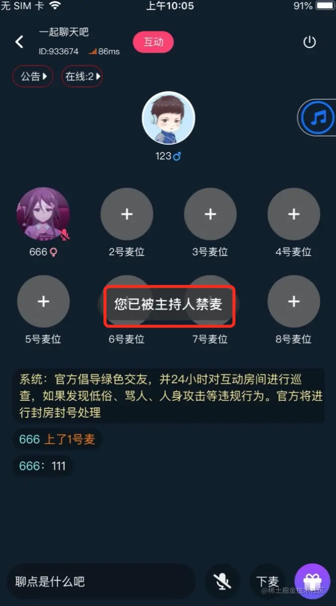 用户进入聊天房后,可以自由选择空闲的麦位上麦,也支持切换到其他麦位。如下图,用户先上了6号麦,又切换到了8号麦。