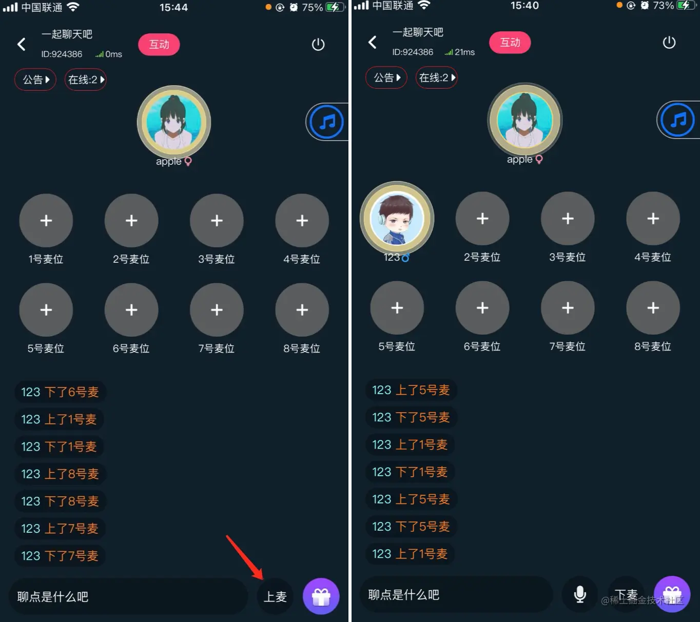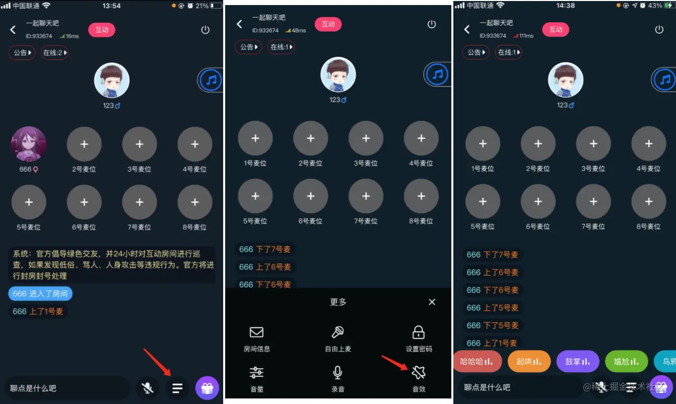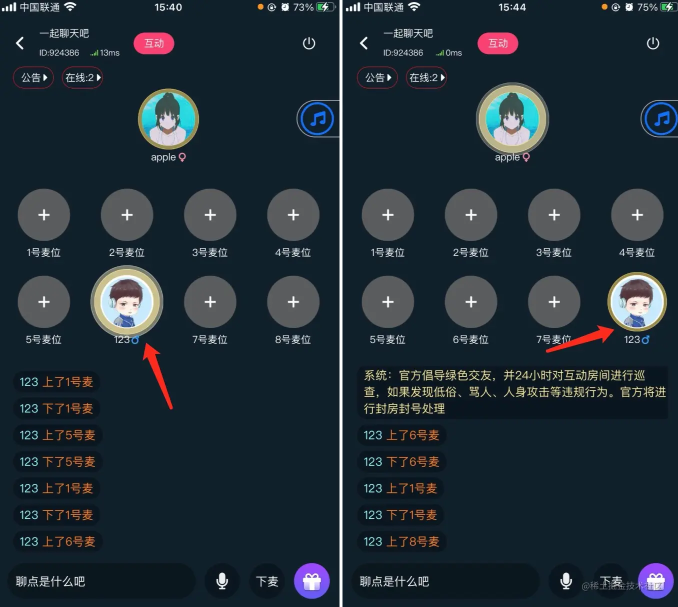 用户进入聊天房后,可以自由选择空闲的麦位上麦,也支持切换到其他麦位。如下图,用户先上了6号麦,又切换到了8号麦。