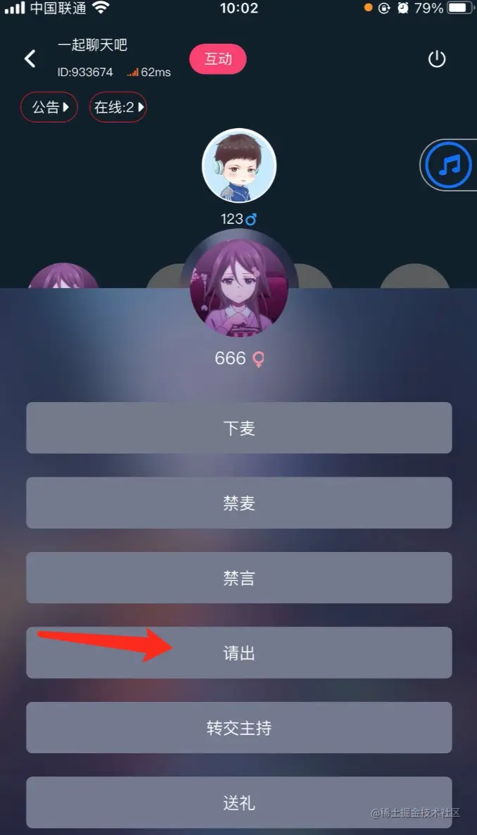 踢人是指房主把麦上的用户踢出房间。房主点击用户头像,会弹出下拉列表,选择“请出”用户就会被请出房间里。房主端如下图所示: