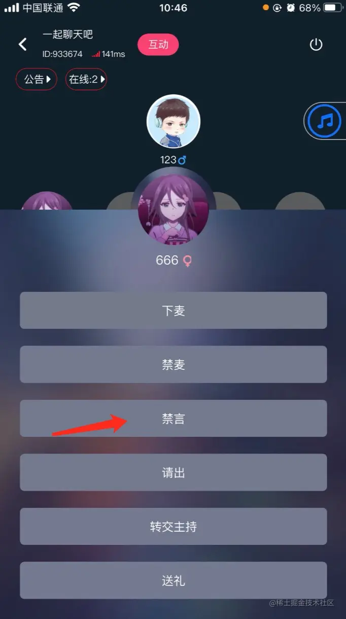 禁麦是指用户被房主禁止发声。房主可以点击用户的头像,会弹出下拉列表,选择“禁麦”用户就无法发声了。房主端如下图所示: