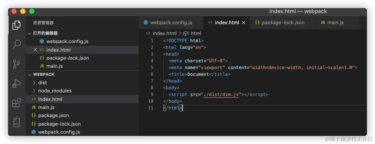 11、然后我们可以创建一个 index.html 在里面引用我们打包出来的 dzm.js,然后通过浏览器打开 index.html, 查看控制台,我们打包出来的 dzm.js 可以正常使用了: