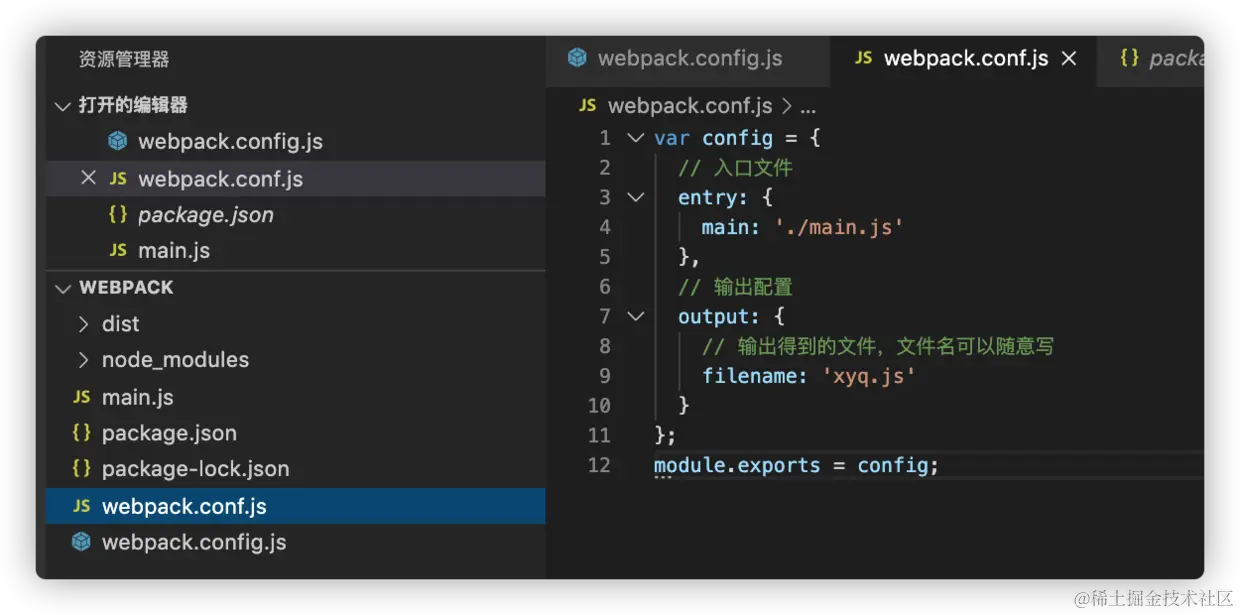10、webpack.config.js 文件其实也可以随便建一个 js 文件代替,内部内容还是一样,比如我创建一个 webpack.conf.js 里面内容配置还是跟 webpack.config.js 一样,当你使用上面 webpack 命令打包时,默认使用的是 webpack.config.js,如果你想通过 webpack.conf.js 打包时,只需要在后面加上指定的配置文件名打包就行: